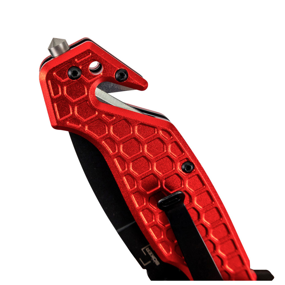 Die Spearpoint-Klinge ist universell einsetzbar und kann wahlweise per Fingerflipper oder Daumen-Pin geöffnet werden. Die Griffschalen aus Flugzeugaluminium 6061 sind in auffälligen Farben eloxiert, was das Messer auch optisch zu einem unverzichtbaren Werkzeug für Brandbekämpfer macht.
