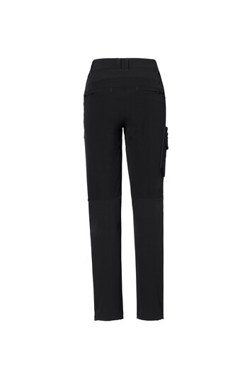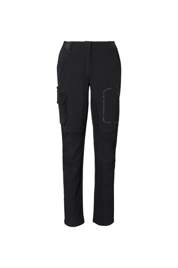 Sportlich leger geschnittene Arbeits- und Freizeithose für Damen, mit verdeckt eingearbeitetem Druckknopf, dehnbarem Hosenbund mit Kordel zur individuellen Weitenregulierung, Reißverschluss und Gürtelschlaufen.
